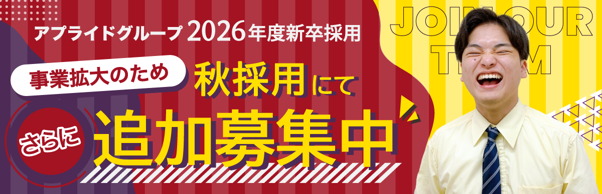 アプライドグループは事業拡大のため、2026年春に卒業予定の新卒学生を、さらに追加募集しております。