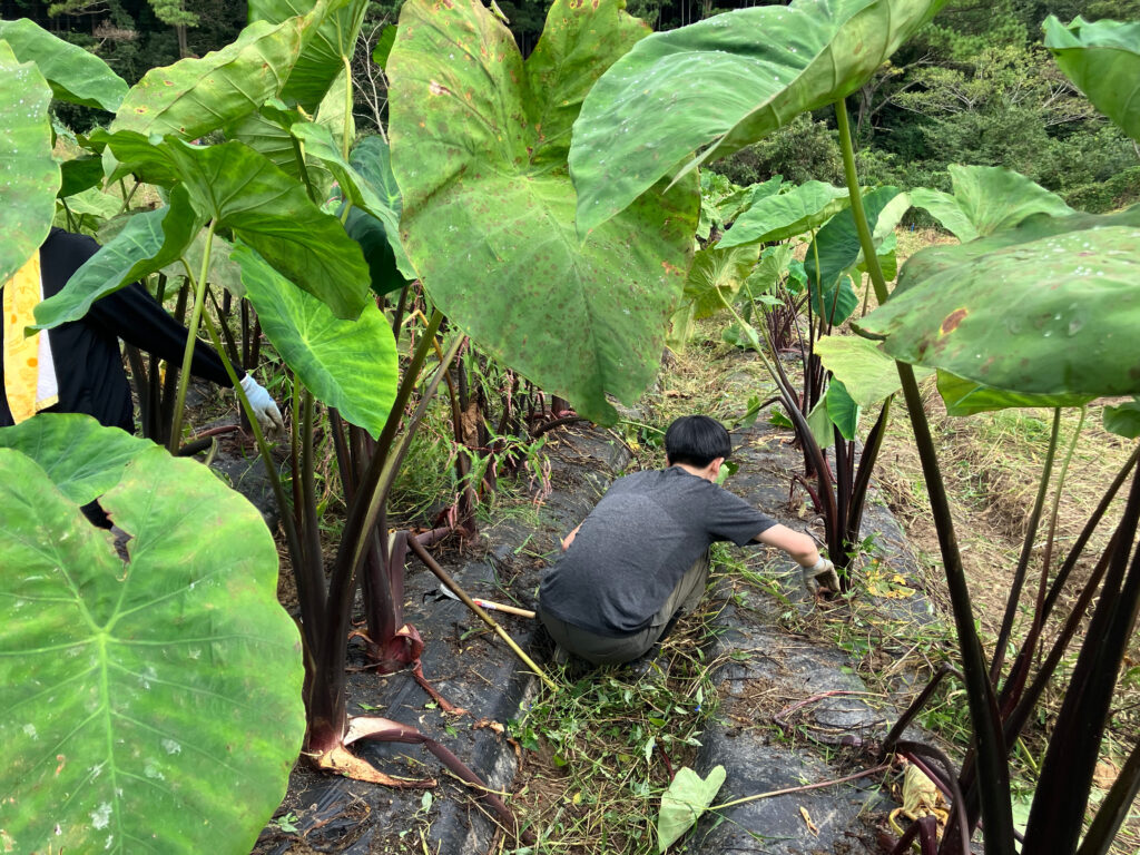 里芋の葉は背丈ほどまで伸びていましたので、下をくぐりながら雑草を取り除いていきます。